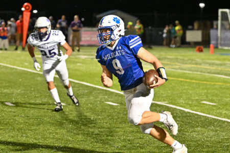 - TIM WEIGHT/For the Express Central Mountain’s Kyle Everett (9) runs toward open field during a football game on Friday, Sept. 19, 2025, at Malinak Stadium. The Wildcats fell 35-7.