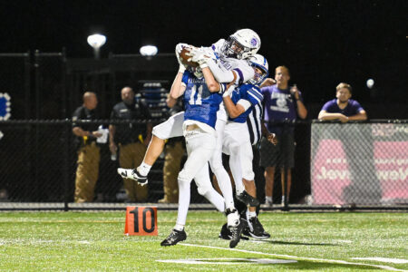 - TIM WEIGHT/For the Express Central Mountain’s Caleb Stitzer (11) secures an acrobatic interception during a football game on Friday, Sept. 19, 2025, at Malinak Stadium. The Wildcats fell 35-7.