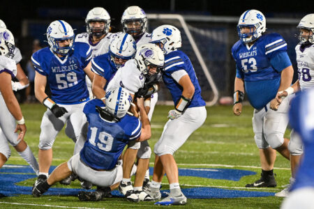 - TIM WEIGHT/For the Express Central Mountain’s Dalton McDermott (24) wraps up a Shamokin runner with multiple Wildcat defenders in pursuit during a football game on Friday, Sept. 19, 2025, at Malinak Stadium. The Wildcats fell 35-7.
