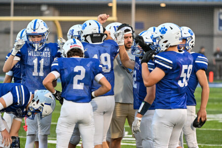 - TIM WEIGHT/For the Express Central Mountain football players listen to a coach during a football game on Friday, Sept. 19, 2025, at Malinak Stadium. The Wildcats fell 35-7.