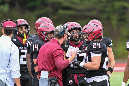 TIM WEIGHT/For the Express A Lock Haven football coach speaks with running back Tucker Teats (24) during a game against Glenville State on Saturday, Sept. 6, 2025, at Hubert Jack Stadium. Teats led the team in rushing on Saturday.
