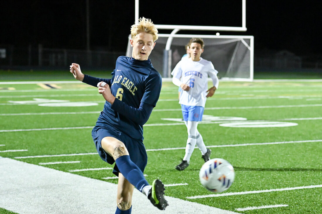 - TIM WEIGHT/For the Express Bald Eagle Area’s Parker Dubbs (6) kicks the ball downfield during a District 6 Class AA quarterfinal boys soccer matchup against Cambria Heights on Wednesday, Oct. 22, 2025, at Alumni Stadium. The Eagles won, 2-1, in overtime.