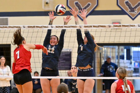 TIM WEIGHT/For the Express Bald Eagle Area's Casey Angelloti, left, and Addelyn Fisher, right, perform a block during the District 6 Class AA volleyball semifinals against Central Cambria on Thursday, Oct. 30, 2025. The Eagles won 3-0.