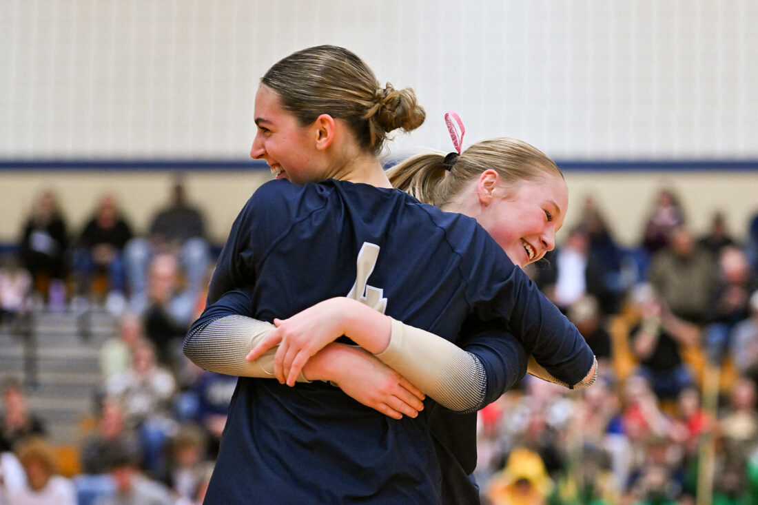 TIM WEIGHT/For the Express Bald Eagle Area's Leah Bryan (4) hugs teammate Nora Eppley during the District 6 Class AA volleyball semifinals against Central Cambria on Thursday, Oct. 30, 2025. The Eagles won 3-0.
