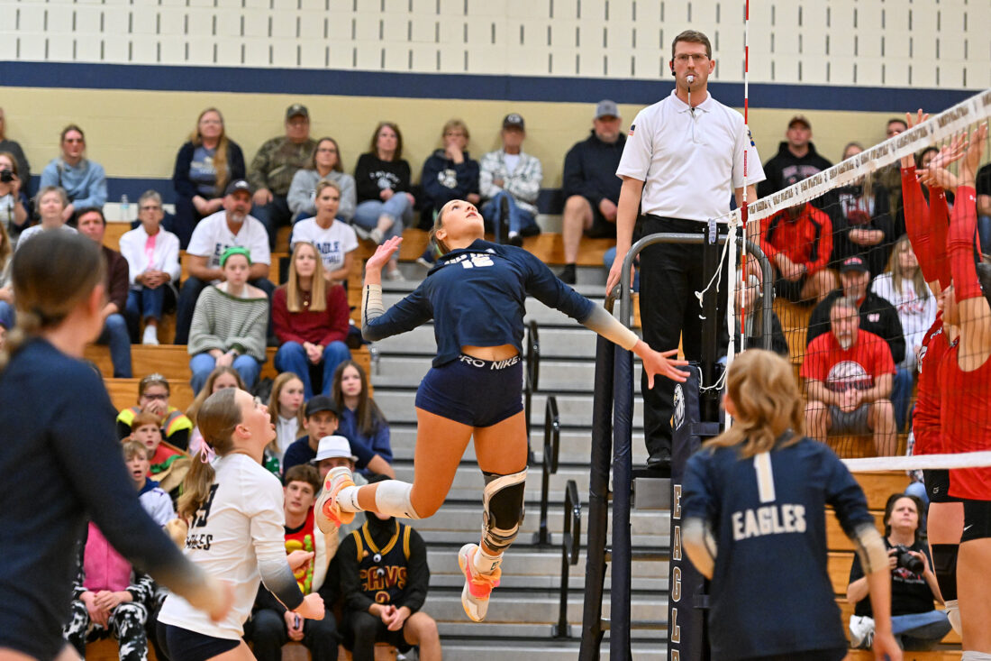 TIM WEIGHT/For the Express Bald Eagle Area's Emily Smith (16) performs a kill during the District 6 Class AA volleyball semifinals against Central Cambria on Thursday, Oct. 30, 2025. The Eagles won 3-0.