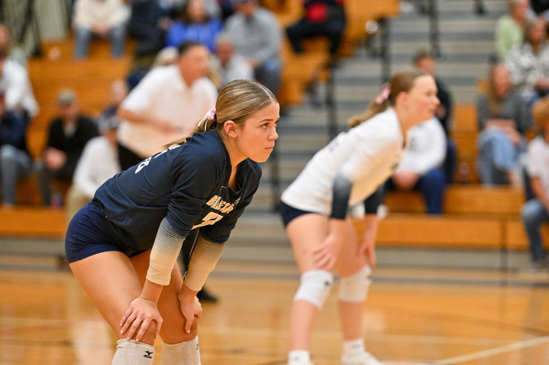 - TIM WEIGHT/For the Express Bald Eagle Area’s Riley Housel, left, locks in during the District 6 Class AA volleyball semifinals against Central Cambria on Thursday, Oct. 30, 2025. The Eagles won 3-0.