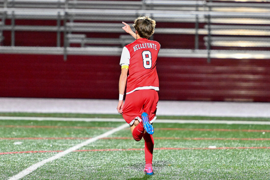 - TIM WEIGHT/For the Express Bellefonte’s Connell Stabinger (8) celebrates a first-half goal during a District 6 Class AAA semifinal matchup against Tyrone on Thursday, Oct. 23, 2025, at Rogers Stadium. The Red Raiders fell, 3-2, in double overtime.