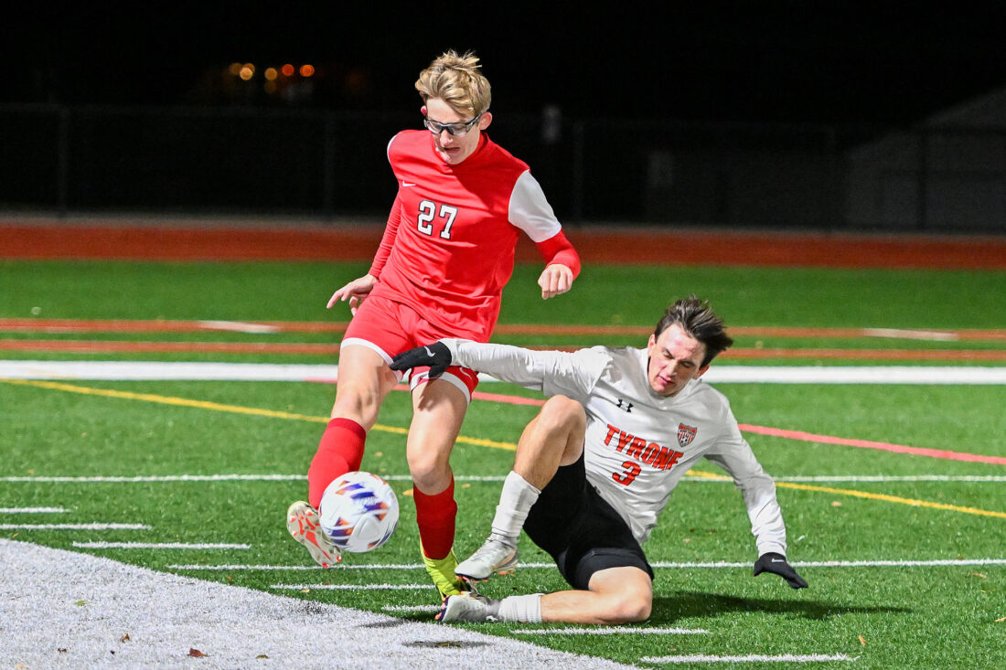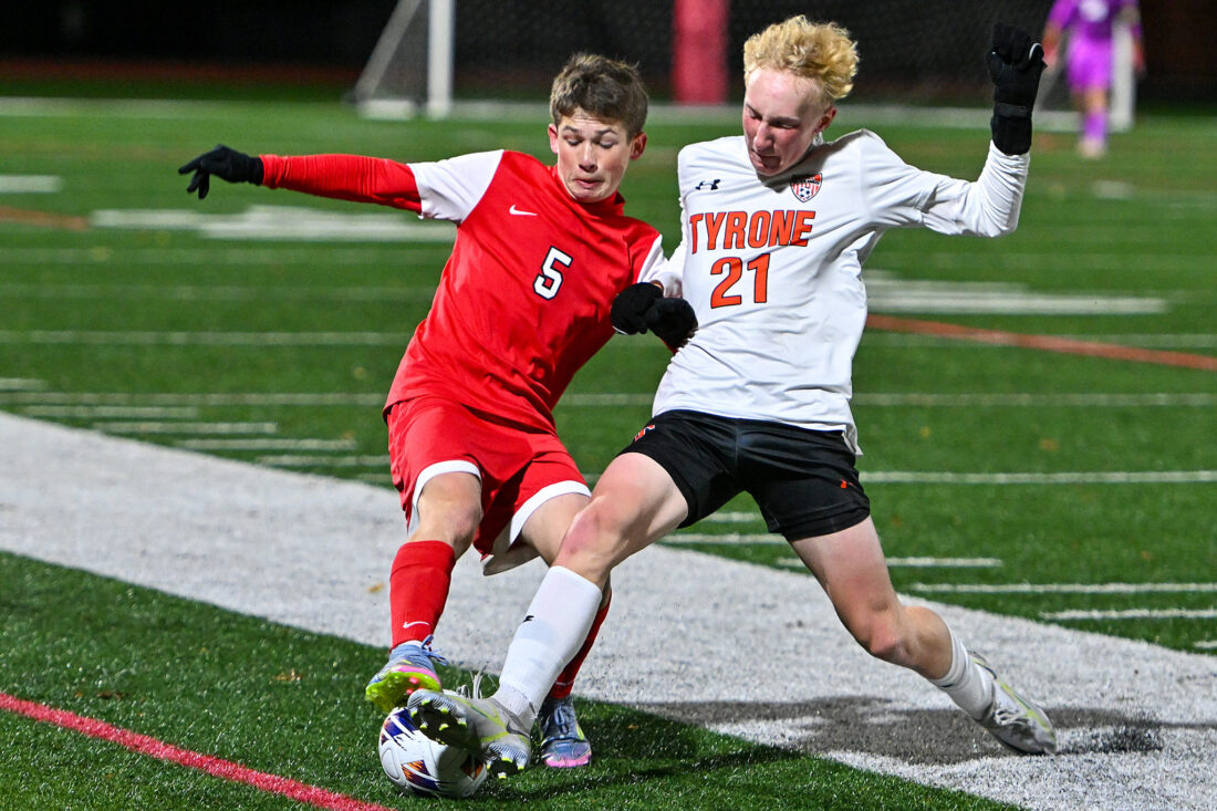 - TIM WEIGHT/For the Express Bellefonte’s Austin Larson (27) battles a Tyrone defender for possession during a District 6 Class AAA semifinal matchup against Tyrone on Thursday, Oct. 23, 2025, at Rogers Stadium. The Red Raiders fell, 3-2, in double overtime.