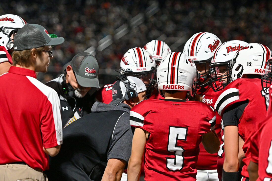 TIM WEIGHT/For the Express The Bellefonte offense huddles up during a football game against Bald Eagle Area on Friday, Sept. 26, 2025, at Rogers Stadium.