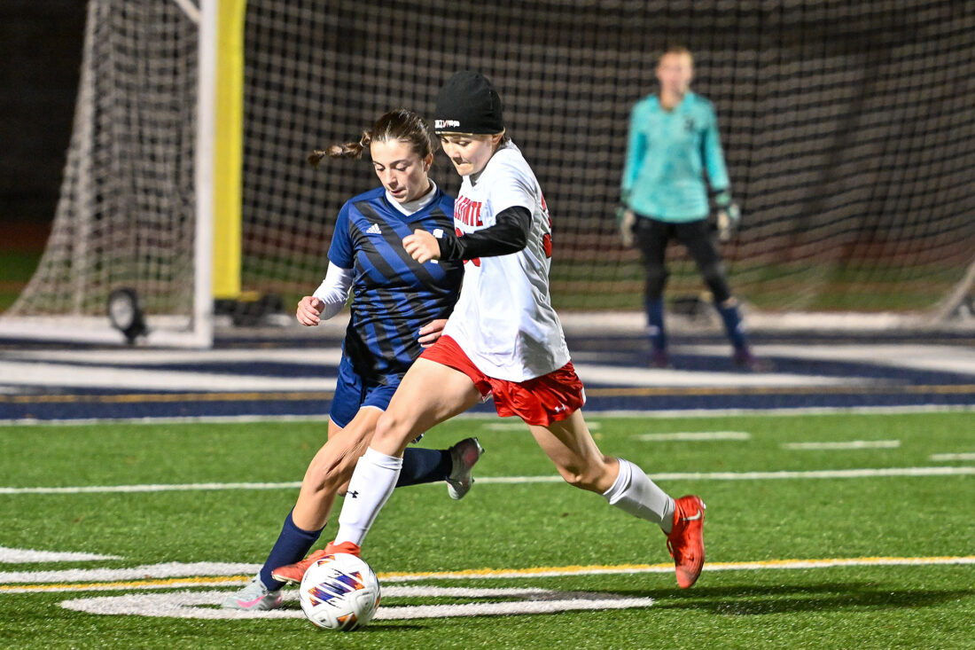- TIM WEIGHT/For the Express Bellefonte’s Brinley DeWeese (23) battles Hollidaysburg’s Lily Chestney (7) for possession during the District 6 Class AAA championship against Hollidaysburg on Tuesday, Oct. 28, 2025, at Mountie Field. The Red Raiders fell 1-0.