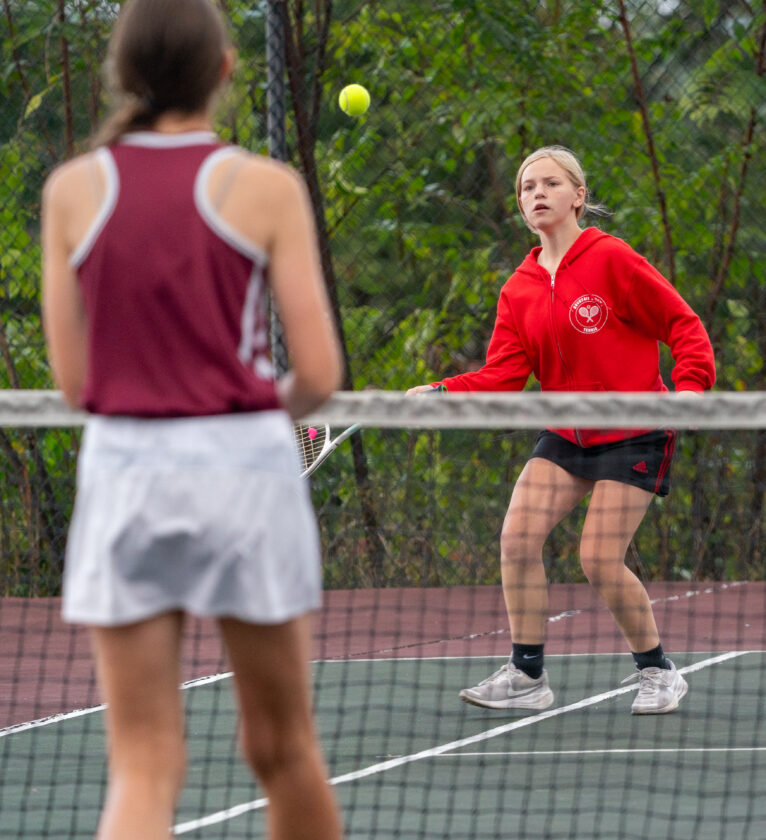 - Carrie Ditty of Bucktail waits to return a shot as she and her doubles team mate Riley Salizzoni play Kinsley Hill and Annalise Berger of Loyalsock at Williamsport High School. DAVE KENNEDY/For The Express