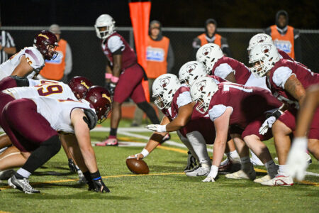 TIM WEIGHT/For the Express The Lock Haven offensive line lines up against Bloomsburg during a football game on Saturday, Oct. 19, 2024, at Hubert Jack Stadium. The Bald Eagles won 35-32 then, and defeated Bloomsburg again last Saturday, 38-17.