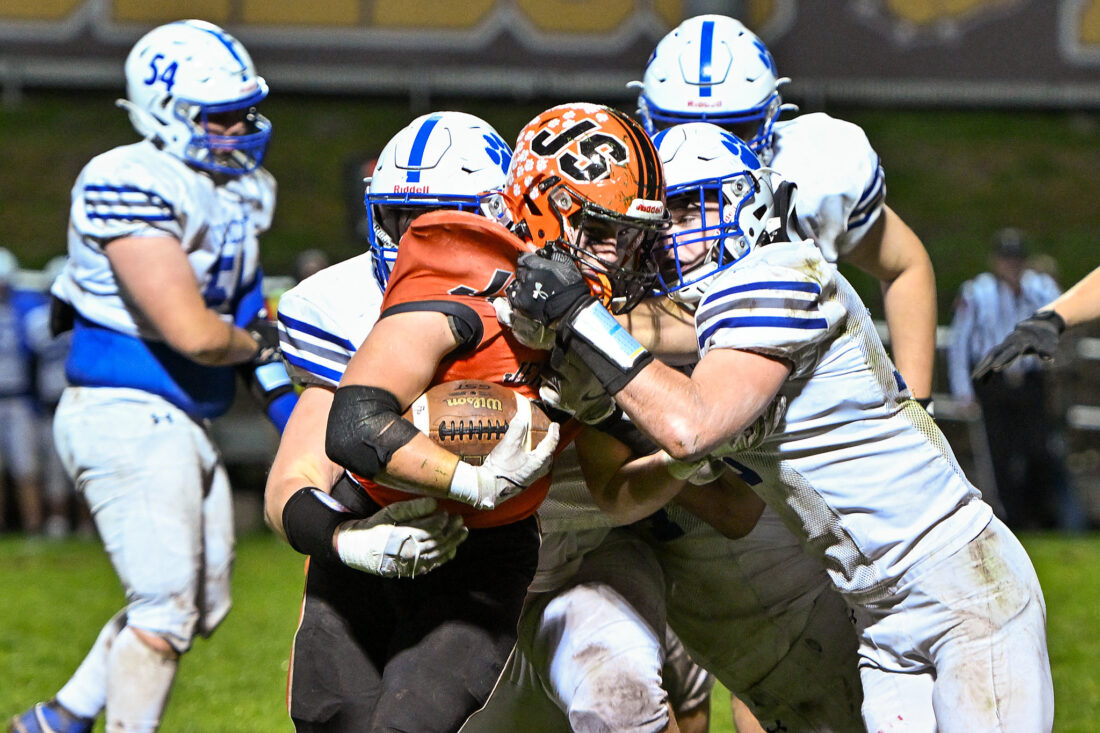 TIM WEIGHT/For the Express Multiple Bulldogs swarm Central Mountain's Dalton McDermott (24) during a football game against Central Mountain on Friday, Oct. 24, 2025, at Thompson Street Stadium. The Bulldogs won 63-26.