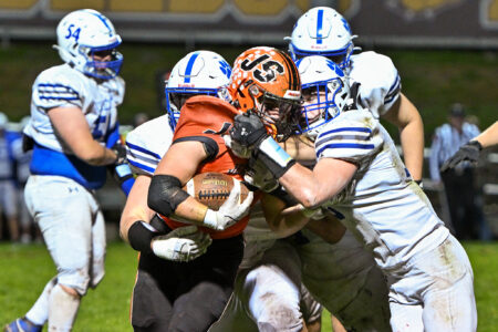 - TIM WEIGHT/For the Express Jersey Shore’s Bo Sechrist (5) gets wrapped up by multiple Wildcats during a football game against Central Mountain on Friday, Oct. 24, 2025, at Thompson Street Stadium. The Bulldogs won 63-26.