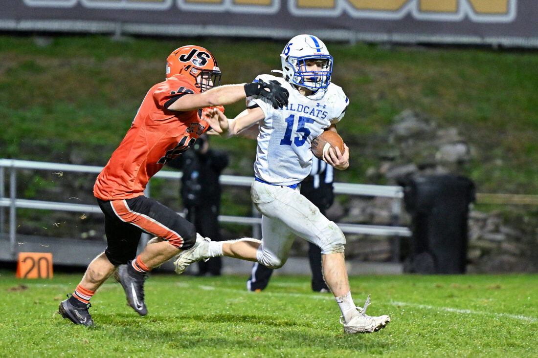 TIM WEIGHT/For the Express Central Mountain's Alex Johnson (15) tries to shake off Jersey Shore's Luke Thompson (10) during a football game against Jersey Shore on Friday, Oct. 24, 2025, at Thompson Street Stadium. The Wildcats fell 63-26.