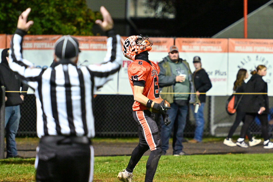 - TIM WEIGHT/For the Express Jersey Shore’s Carson Watkins (6) celebrates a touchdown during a football game against Central Mountain on Friday, Oct. 24, 2025, at Thompson Street Stadium. The Bulldogs won 63-26.