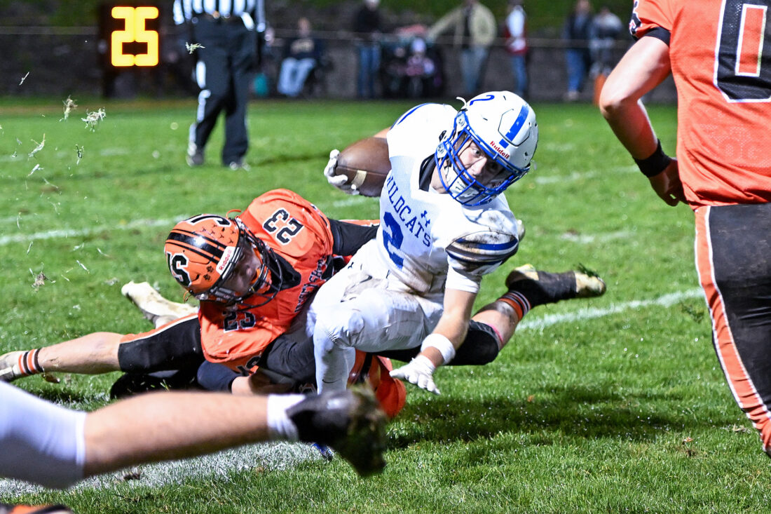 - TIM WEIGHT/For the Express Central Mountain’s Gavin Heverly (2) fights for extra yardage during a football game against Jersey Shore on Friday, Oct. 24, 2025, at Thompson Street Stadium. The Wildcats fell 63-26.