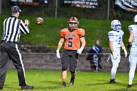 - TIM WEIGHT/For the Express Jersey Shore’s Bo Sechrist (5) tosses a referee the ball after scoring a touchdown during a football game against Central Mountain on Friday, Oct. 24, 2025, at Thompson Street Stadium. The Bulldogs won 63-26.