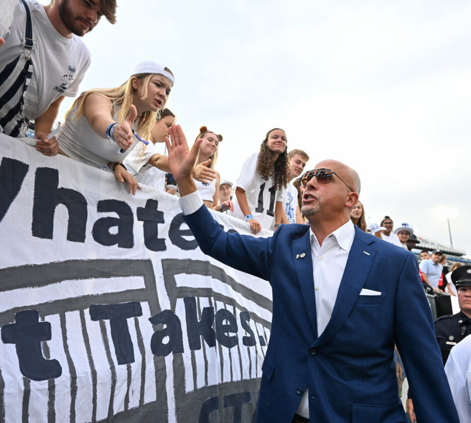 Penn State head coach James Franklin greets fans before an NCAA college football game against Oregon, Saturday, Sept. 27, 2025, in State College, Pa. (AP Photo/Barry Reeger)