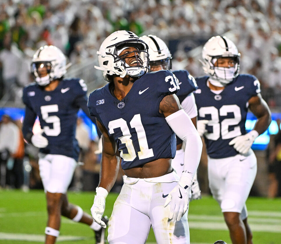 TIM WEIGHT/For the Express Multiple Penn State defenders take the field during the team’s White Out matchup against Oregon on Saturday, Sept. 27, 2025, at Beaver Stadium in State College. The Nittany Lions fell, 30-24, in overtime. They’re looking to bounce back vs. UCLA this Saturday, with road game set for 3:30 p.m.