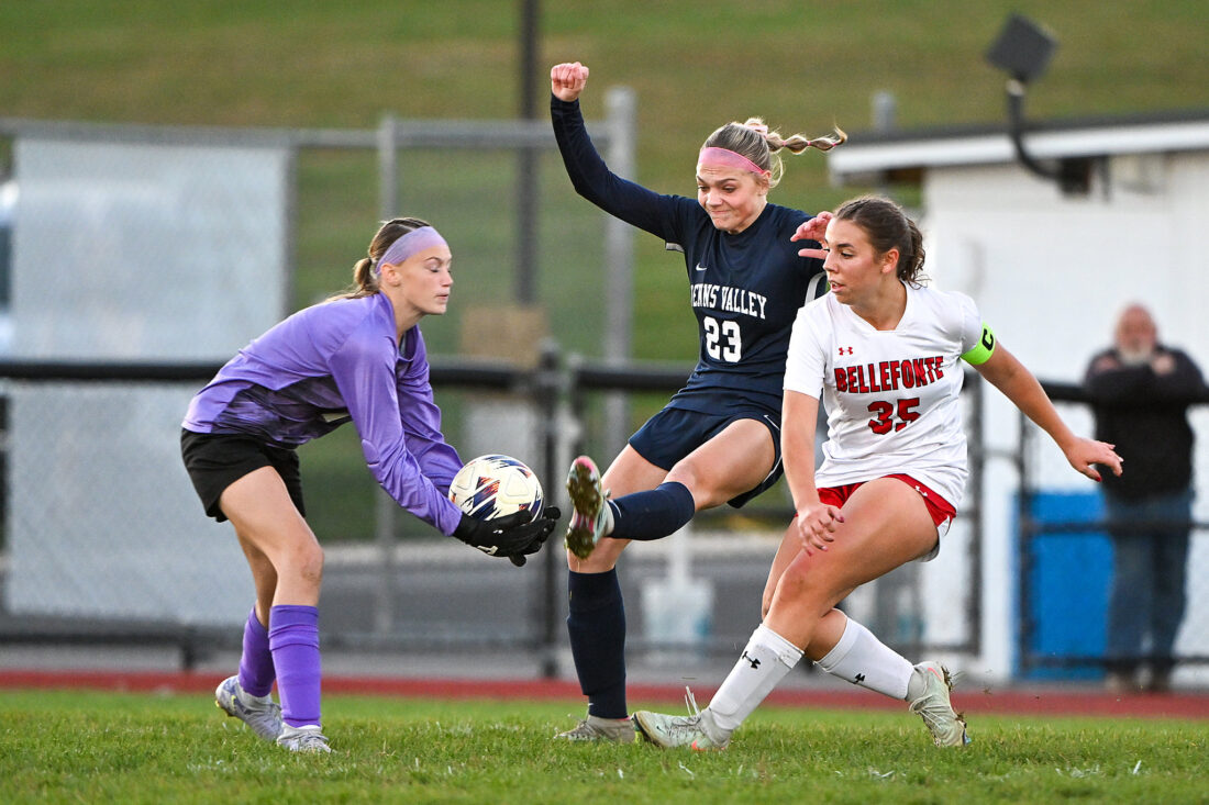 - TIM WEIGHT/For the Express Bellefonte goalkeeper Ronni Spotts secures a save during a girls soccer game against Penns Valley on Tuesday, Oct. 14, 2025, in Spring Mills. The Red Raiders won 3-0.