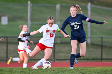 - TIM WEIGHT/For the Express Bellefonte’s Piper Breon (22) kicks the ball downfield during a girls soccer game against Penns Valley on Tuesday, Oct. 14, 2025, in Spring Mills. The Red Raiders won 3-0.