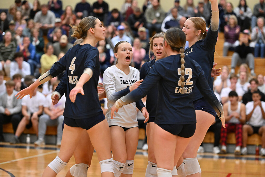 TIM WEIGHT/For the Express Bald Eagle Area volleyball players gather to celebrate a point during a state tournament matchup against Hopewell on Tuesday, Nov. 4, 2025, at Bald Eagle Area. The Eagles capped their run in state quarters on Saturday, falling to Corry, 3-0.