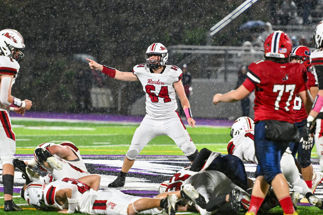 - TIM WEIGHT/For the Express Bellefonte’s Ben Cherinka (64) signals a turnover during the District 6 Class 4A football championship against Juniata on Friday, Nov. 7, 2025, at Mifflin County. The Red Raiders won 17-6.