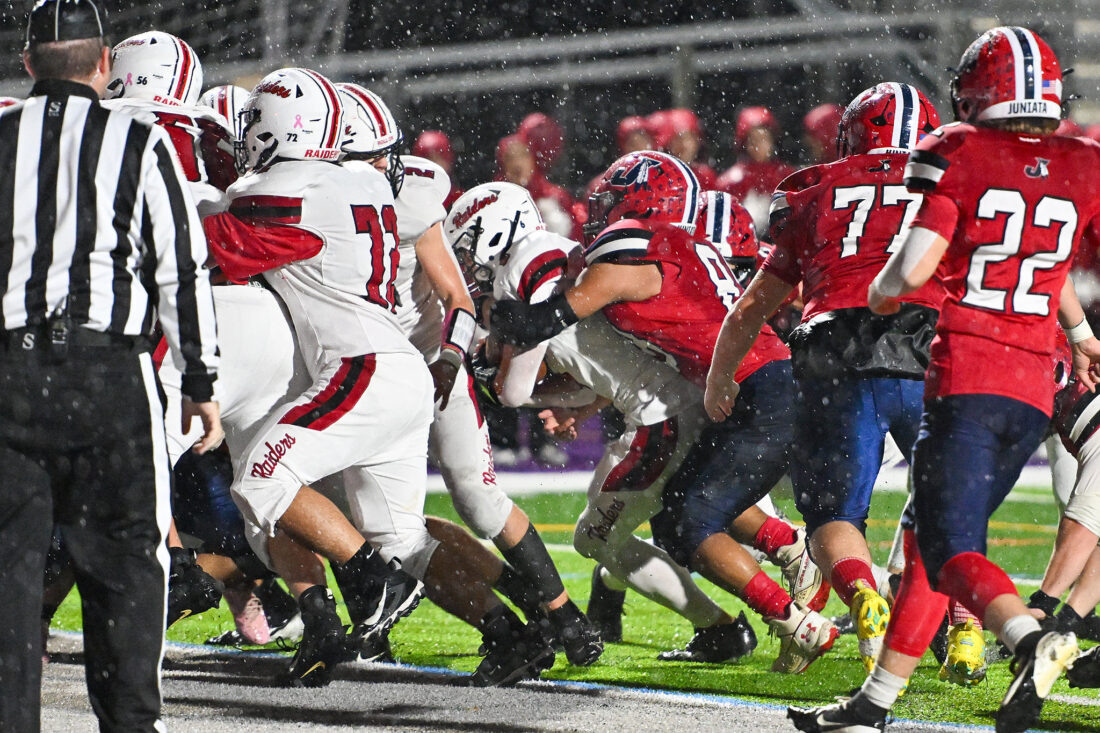 For the fifth straight year, Juniata’s route to a District 6 Class AAAA championship against Bellefonte. This time, despite a hard fought effort by Juniata, it would be the Red Raiders that would come out of the contest victorious, as they battled ground and pound contest, winning 17-6.