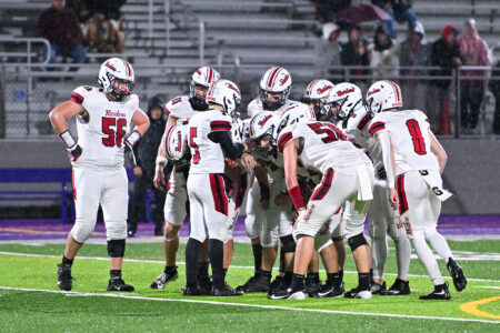 TIM WEIGHT/For the Express The Bellefonte offense huddles up during the District 6 Class 4A football championship against Juniata on Friday, Nov. 7, 2025, at Mifflin County. The Red Raiders won 17-6.