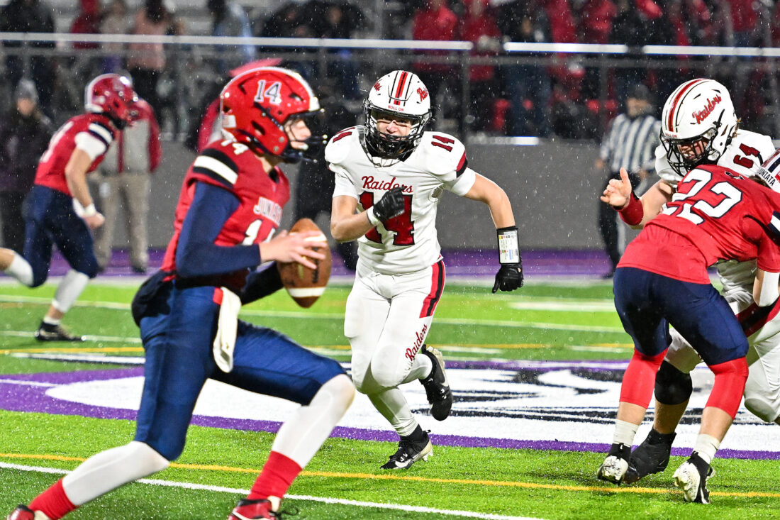 - TIM WEIGHT/For the Express Bellefonte’s Nash Weaver (14) rushes Juniata’s quarterback during the District 6 Class 4A football championship against Juniata on Friday, Nov. 7, 2025, at Mifflin County. The Red Raiders won 17-6.