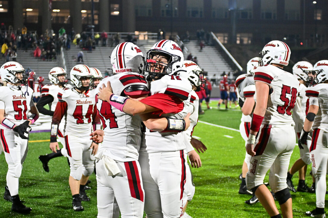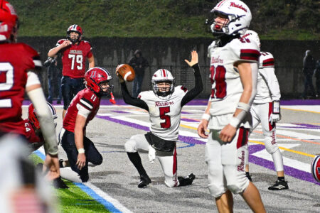 TIM WEIGHT/For the Express Bellefonte's Ashten Howell (5) celebrates a rushing touchdown during the District 6 Class 4A football championship against Juniata on Friday, Nov. 7, 2025, at Mifflin County. The Red Raiders won 17-6.