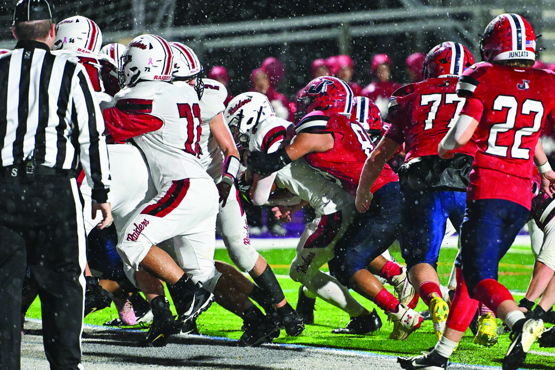 TIM WEIHGT/For The Express Bellefonte’s Ashten Howell crosses the goal line to score a touchdown against Juniata in last week’s District 6 Class AAAA championshp. The Red Raiders host Shamokin tonight in the first round of states.