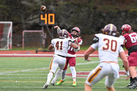 TIM WEIGHT/For the Express Lock Haven's Jackson Orlowsky (11) passes the ball under pressure during a football game against Gannon on Saturday, Nov. 15, 2025, at Hubert Jack Stadium. The Bald Eagles won, 49-28, to clinch their first winning season since 1981.