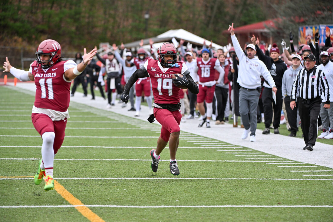 TIM WEIGHT/For the Express Lock Haven's Mekhi Watson (19) sprints into the end zone as Jackson Orlowsky (11) celebrates alongside him during a football game against Gannon on Saturday, Nov. 15, 2025, at Hubert Jack Stadium. The Bald Eagles won, 49-28, to clinch their first winning season since 1981.