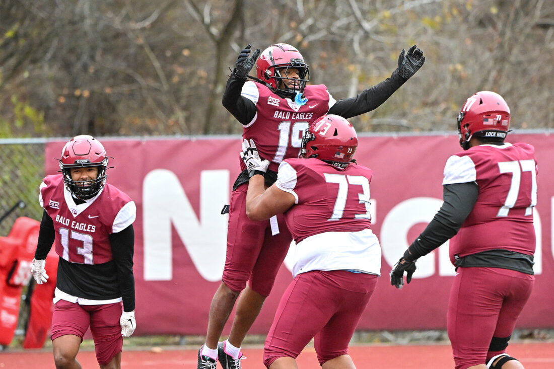 TIM WEIGHT/For the Express Lock Haven's Mekhi Watson (19) gets lifted in the air by Christian Bundra (73) after a touchdown during a football game against Gannon on Saturday, Nov. 15, 2025, at Hubert Jack Stadium. The Bald Eagles won, 49-28, to clinch their first winning season since 1981.