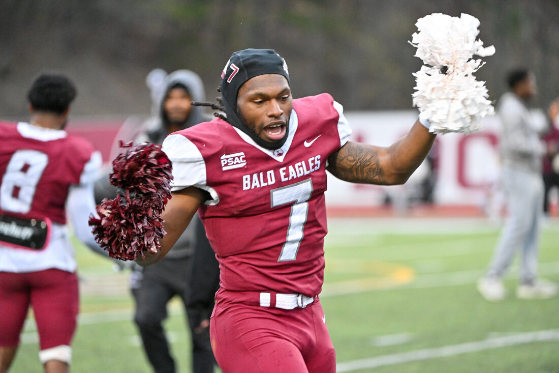 TIM WEIGHT/For the Express Lock Haven's Markel Morgan (7) celebrates with pom-poms during a football game against Gannon on Saturday, Nov. 15, 2025, at Hubert Jack Stadium. The Bald Eagles won, 49-28, to clinch their first winning season since 1981.
