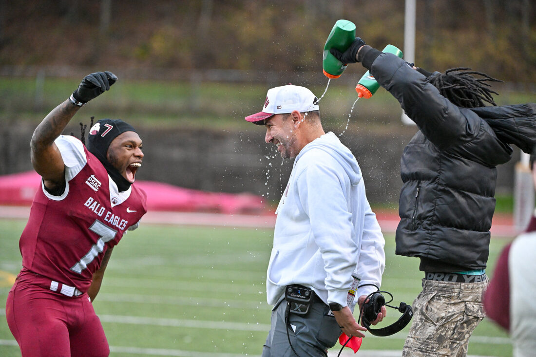 TIM WEIGHT/For the Express Lock Haven football head coach Joe Battaglia gets showed by Gatorade as Markel Morgan (7) celebrates during a football game against Gannon on Saturday, Nov. 15, 2025, at Hubert Jack Stadium. The Bald Eagles won, 49-28, to clinch their first winning season since 1981.