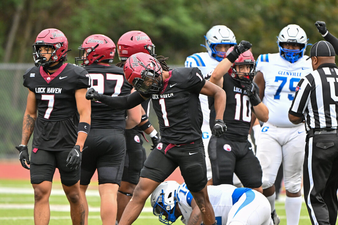 TIM WEIGHT/For the Express Lock Haven's Markel Morgan (1) and Rocco Daugherty (10) celebrate a stop during a football game against Glenville State on Saturday, Sept. 5, 2025. Morgan and Daugherty were named first teamers on the PSAC all-star team for football.