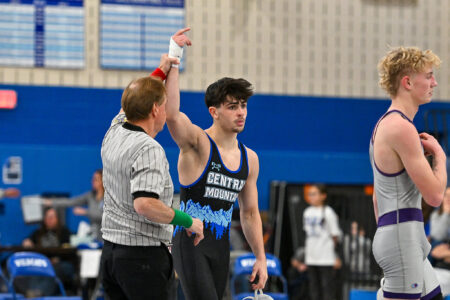 - TIM WEIGHT/For the Express Central Mountain’s Patrick Tarantella get his hand raised during a dual match against Mifflin County on Tuesday, Dec. 9, 2025, at Central Mountain. The Wildcats won 37-28.