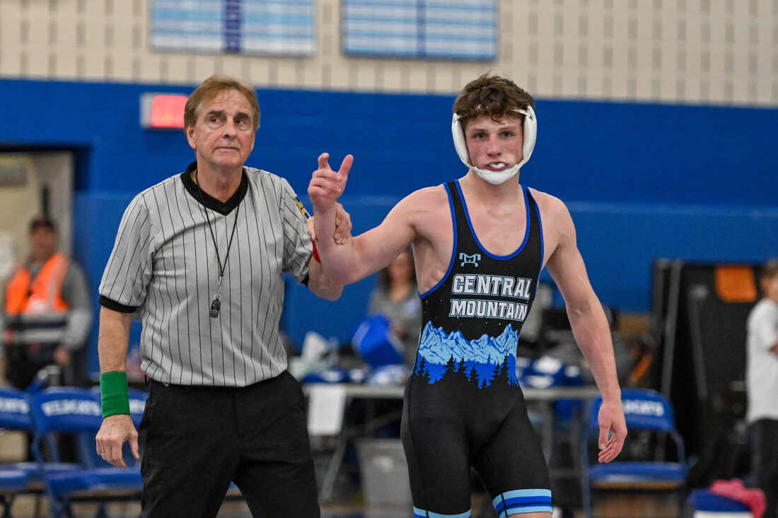 - TIM WEIGHT/For the Express Central Mountain’s Aiden Kunes gets his hand raised during a dual match against Mifflin County on Tuesday, Dec. 9, 2025, at Central Mountain. The Wildcats won 37-28.