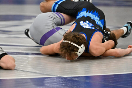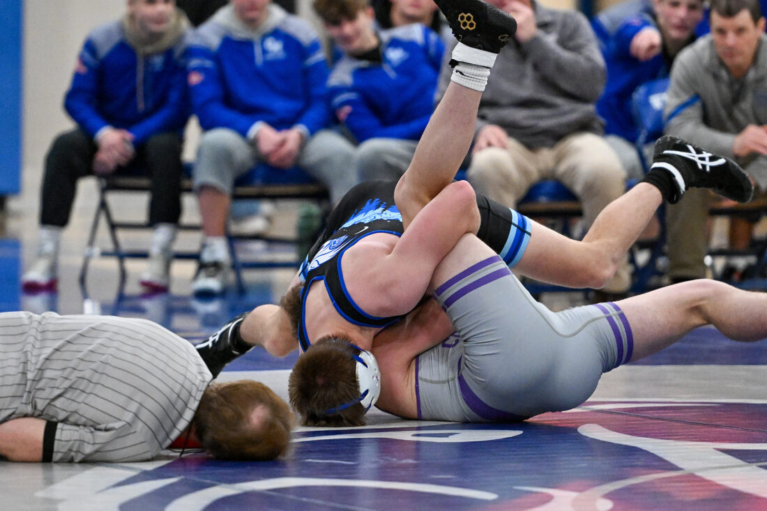 At 145, Aiden Kunes – ranked No. 4 in the state – worked tirelessly to secure the team’s second pin, consistently getting opponent Layten Bowersox into a position to pin before Bowersox found a way to get back to his stomach. However, just before Kunes posted a tech fall, he got the adjustment he needed to secure the pin, granting his team an extra bonus point.