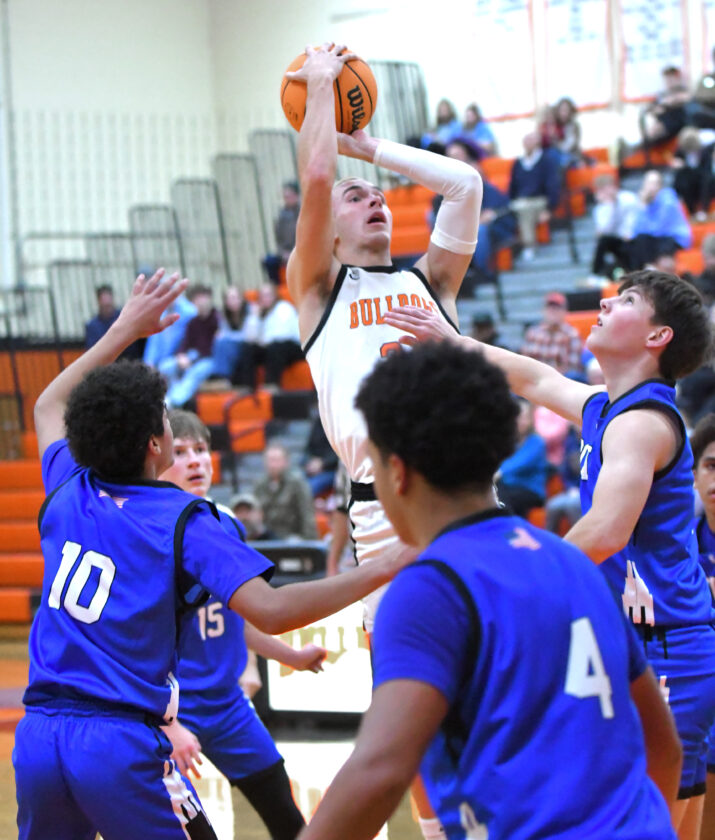 - MARK NANCE/For The Express Jersey Shore’s Ty McDermit (33) shoots between South Williamsport’s Chance Quimby (11) and Andrew Walter (1) in the third quarter.