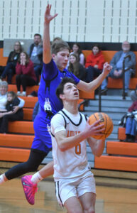 - MARK NANCE/For The Express Jersey Shore’s Carson Watkins (0) prepares to shoot under South Williamsport’s Levi Butler (15) in the first quarter.