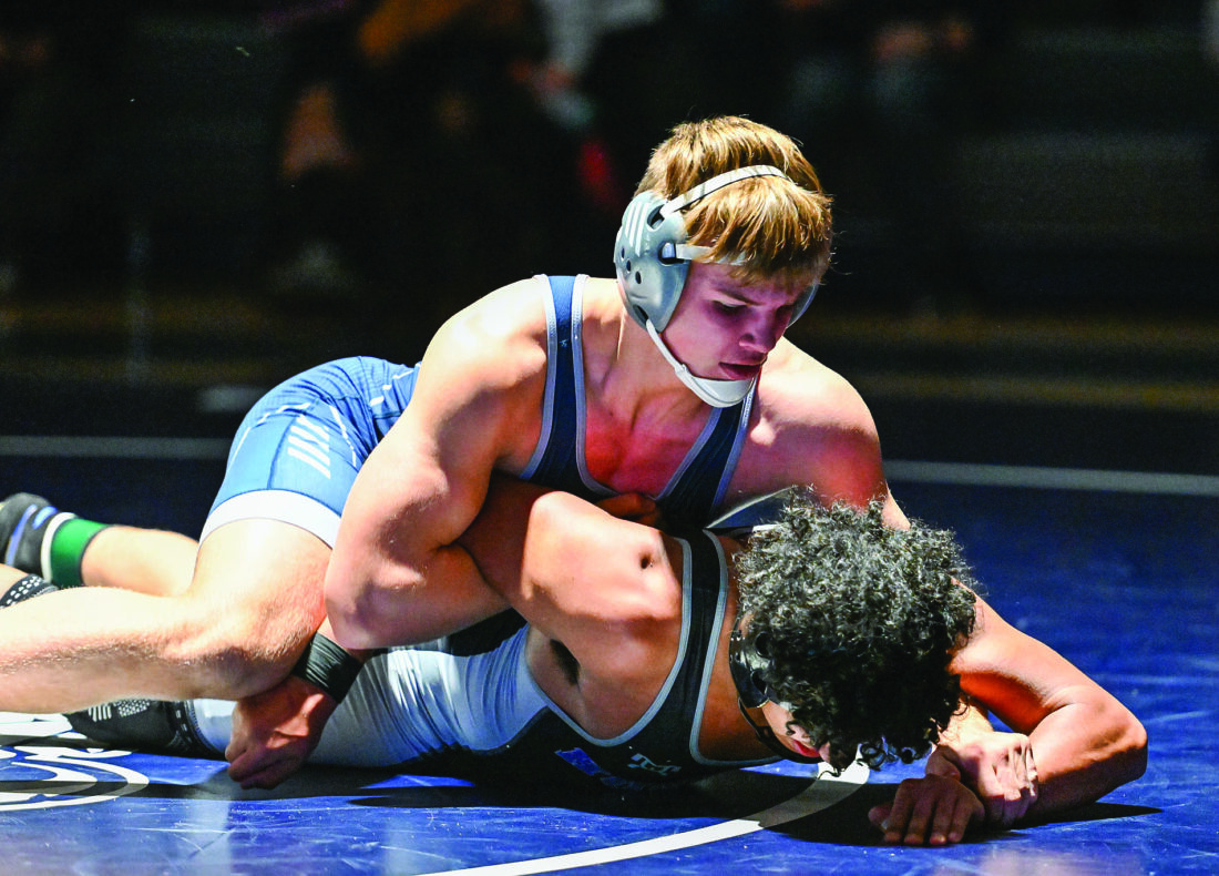 TIM WEIGHT/For The Express Penns Valley’s Brayden Lisowski wrestles against Mifflin County’s Dominique Siennick at 172 pounds. Lisowski won via tech fall, 18-2, 5:03.
