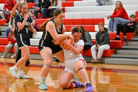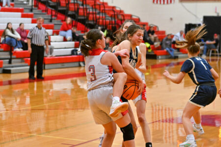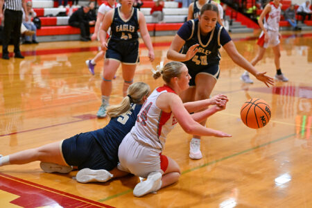 Bald Eagle Area and Bellefonte battle for a loose ball during a girls basketball game on Wednesday, Dec. 17, 2025, at Bellefonte. The Eagles won 41-22.