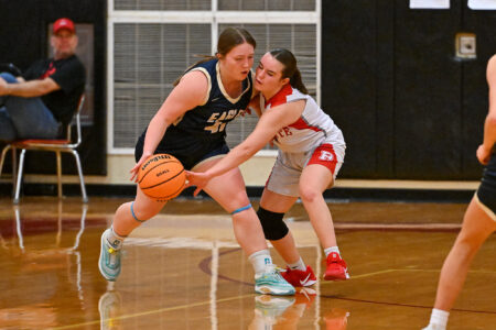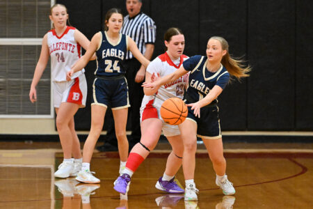 - TIM WEIGHT/For the Express Bald Eagle Area’s Kinsey Clark battles Bellefonte’s Hannah Sampsel for possession during a girls basketball game on Wednesday, Dec. 17, 2025, at Bellefonte. The Eagles won 41-22.