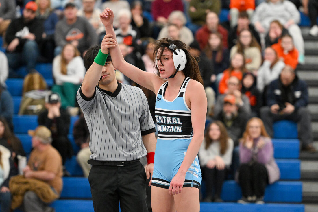 - TIM WEIGHT/For the Express Central Mountain’s Austynn Falls gets her hand raised during a girls wrestling dual against Jersey Shore on Thursday, Jan. 22, 2026, at Central Mountain. The Wildcats won 44-4.