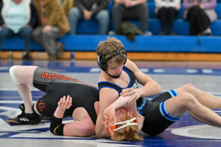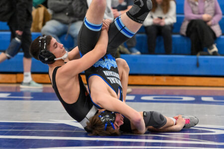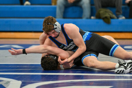 Patrick Tarantella (133) wasn’t far behind them, securing his 19 seconds into the second. Aiden Kunes (152) racked up four takedowns through the fourth to post a late tech fall against defending District 4 champ Louden Spotts. And Angelo Tarantella (114) and Gavin Heverly (127) rounded out the team’s wins, winning by forfeit.