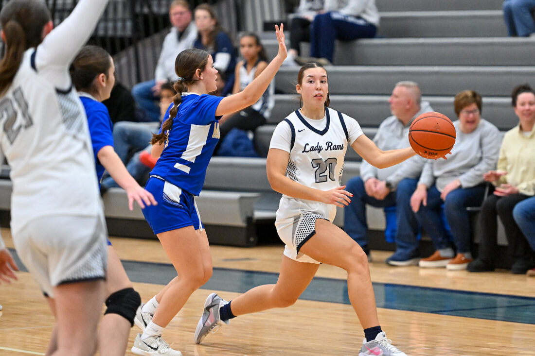 - TIM WEIGHT/For the Express Penns Valley’s Ellie Romig (20) passes to a teammate during a girls basketball game against Mount Union on Friday, Jan. 2, 2026, at Penns Valley. The Rams won 52-15.